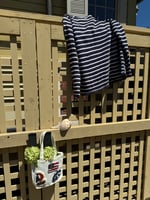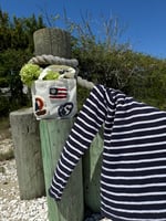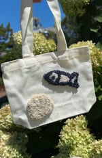 This mini canvas tote bag has hand tufted icons on each side. Each icon measures roughly 4”. Bag measurements 8” x 10”, strap 14”.