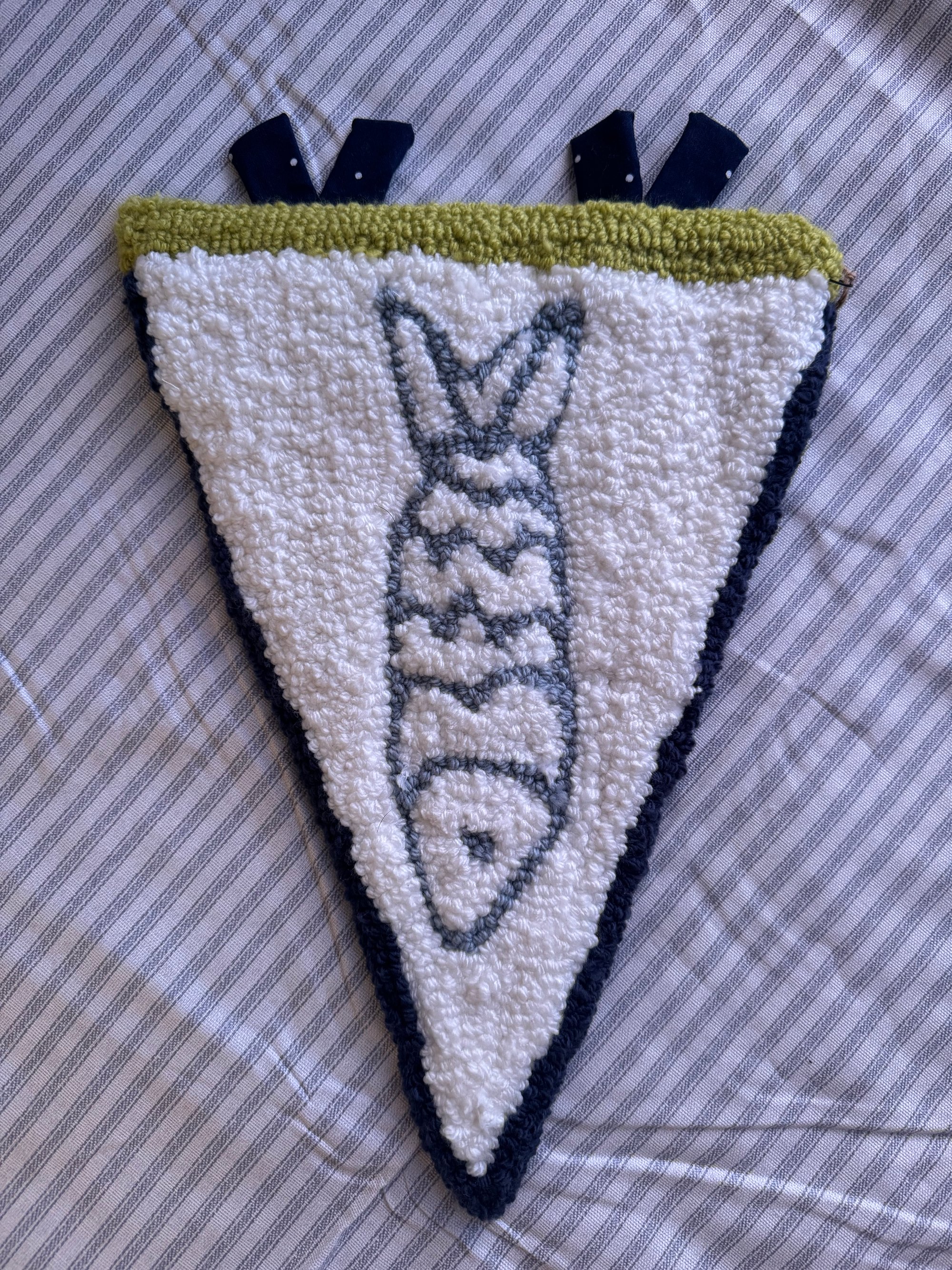 This hand tufted wall hanging measures 10” x 13”, is backed with 2 D-hooks for easy hanging.