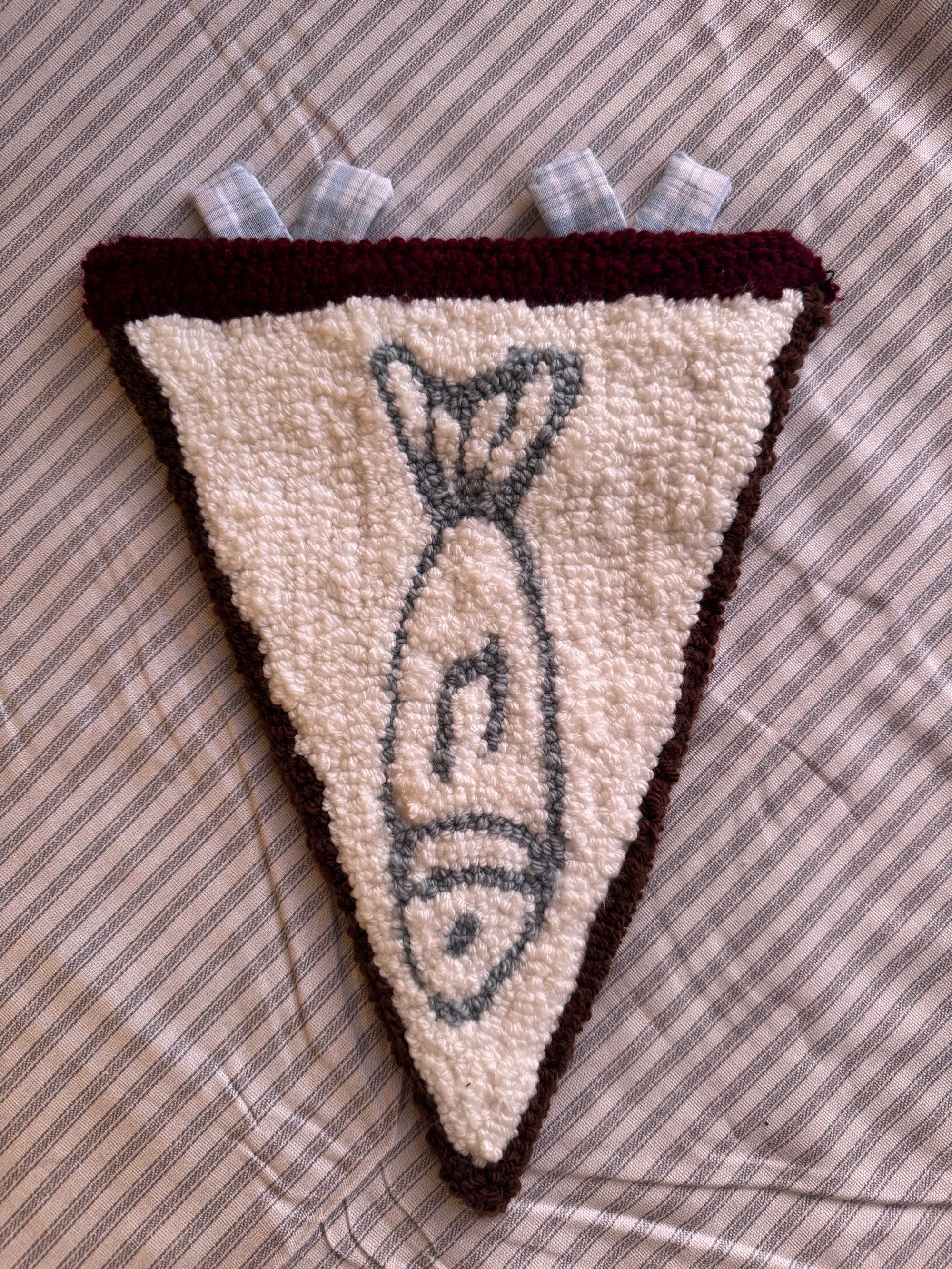 The his hand tufted wall hanging measures 9” x 12”, is backed with 2 D-hooks for easy hanging.