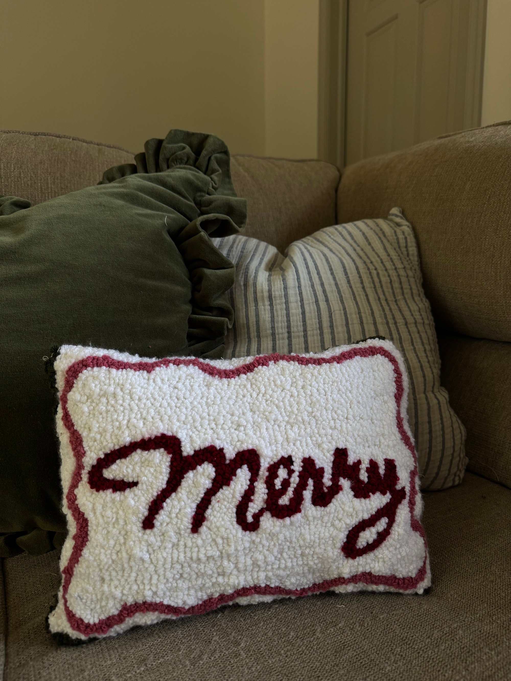 This 100% and tufted pillow measures roughly 9” x 14”.