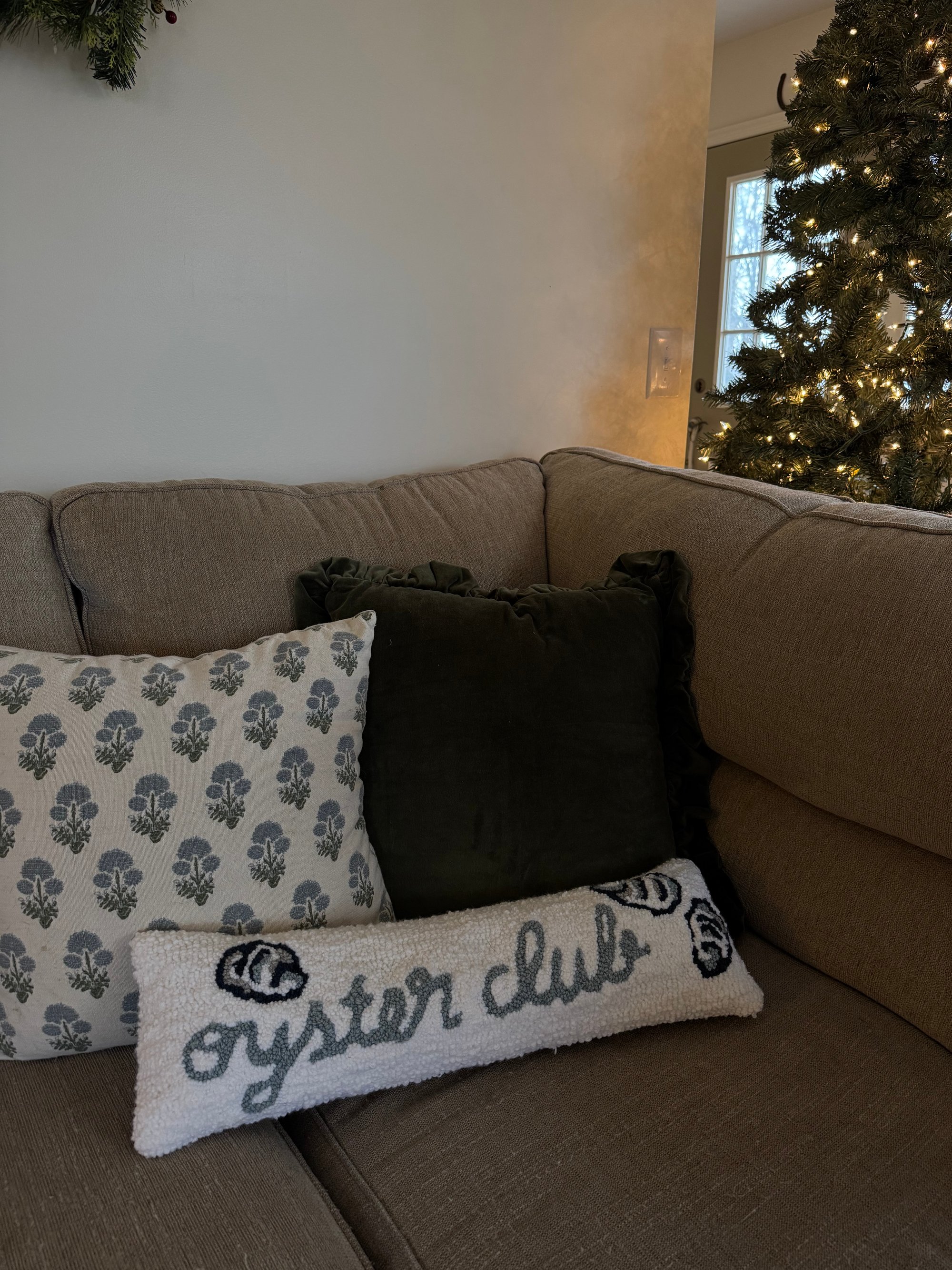 This 100% and tufted pillow measures roughly 8” x 22”.